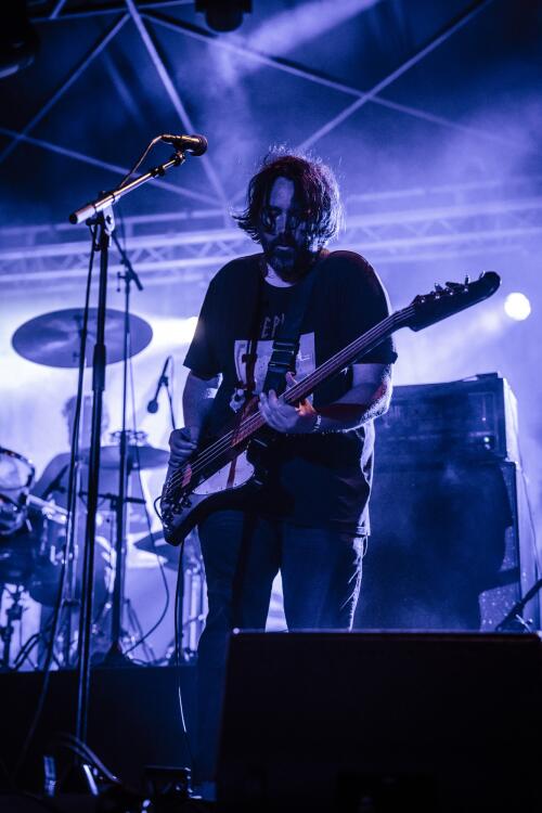 Grosse dinguerie. Je ne les avais pas revus depuis 2017, alors que le groupe se formait à peine, où j'avais déjà été bluffé par leur performance. Stylistiquement, c'est tout ce que j'aime, un mélange Post-Hardcore, Crust et Black Metal, avec une alternance entre chant clair et saturé. La chanteuse est impressionnante par son coffre et son énergie, et est bien plus à l'aise sur scène que la première fois que je les ai vus, où elle avait encore du mal à faire face au public. Je ne doute pas que ce soit une personne timide à la base, timidité que l'on a retrouvée au moment de parler directement au public. Mais dès que ça crie ou que ça blaste, c'est la guerre et elle ne fera pas de prisonniers. Naturellement, j'aime beaucoup, c'est de la musique triste, c'est ce que j'attendais le plus de ce début de festival. Du Hakimcore de grande qualité, haha ! Et je vais vous le dire, mais en vrai, ça ressemble à un groupe belge pour lequel j'ai un respect monumental : Oathbreaker. Et rien que pour ça vous devriez écouter.