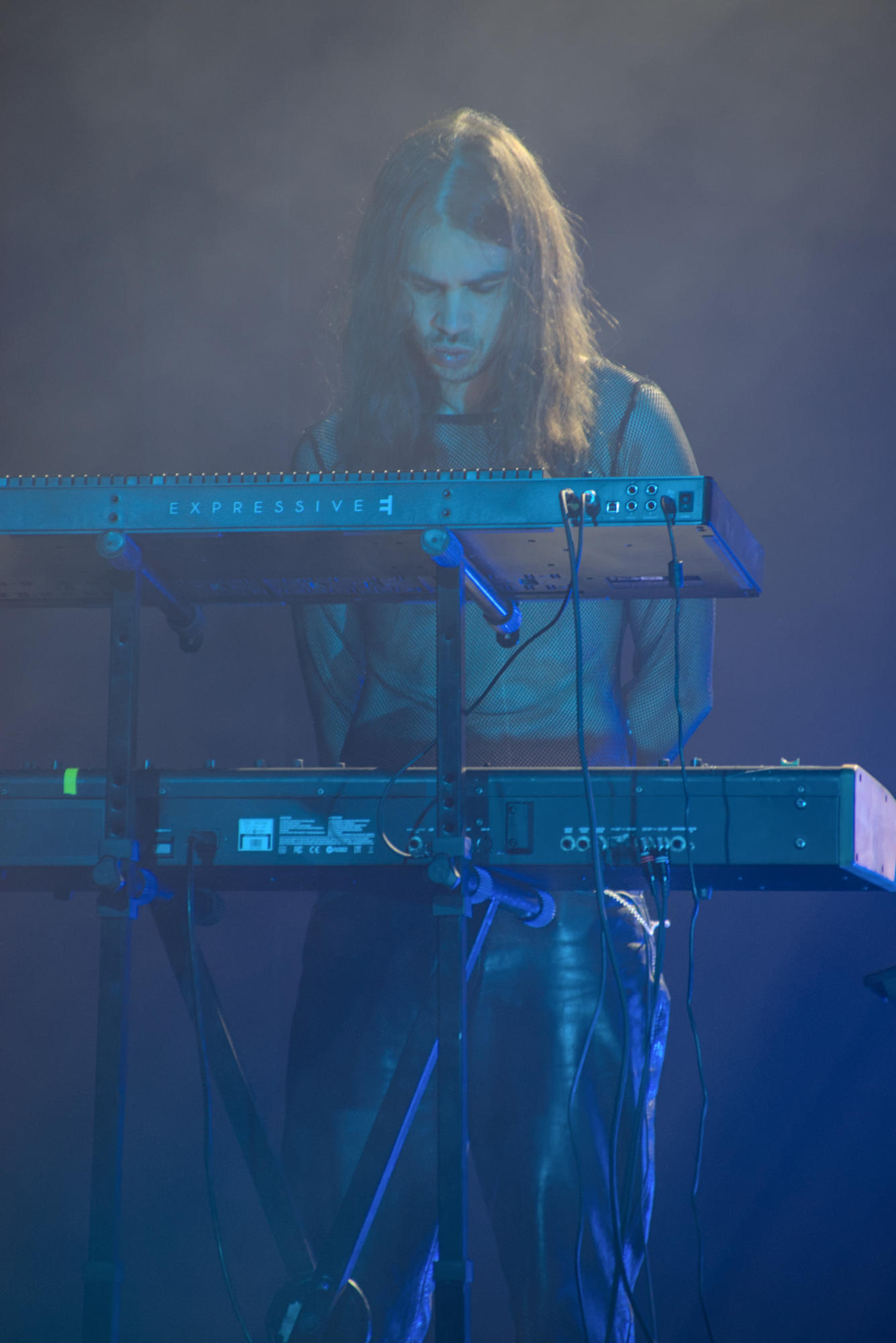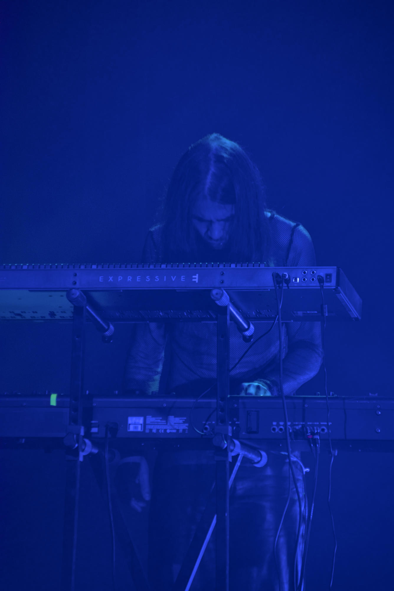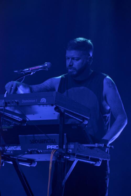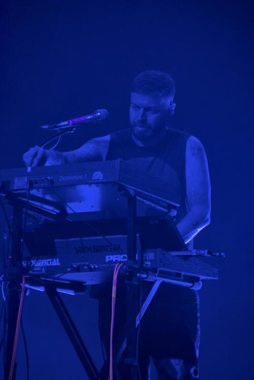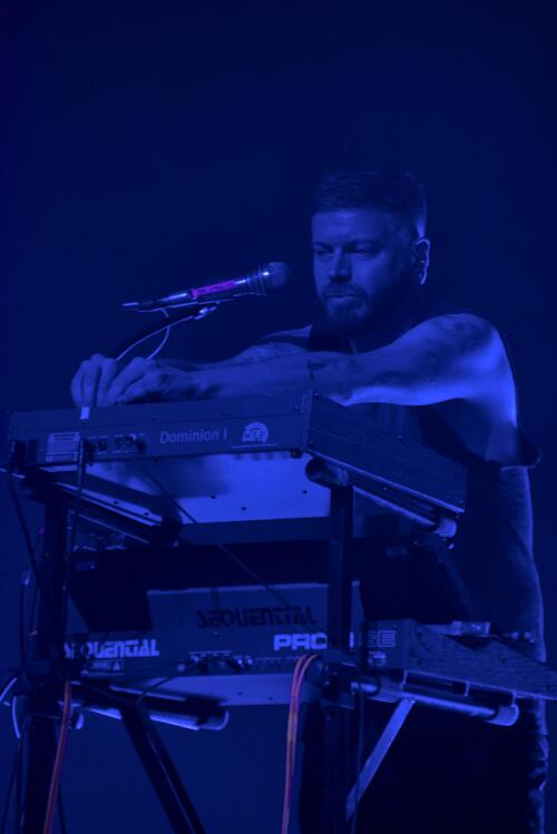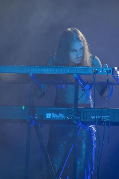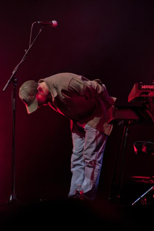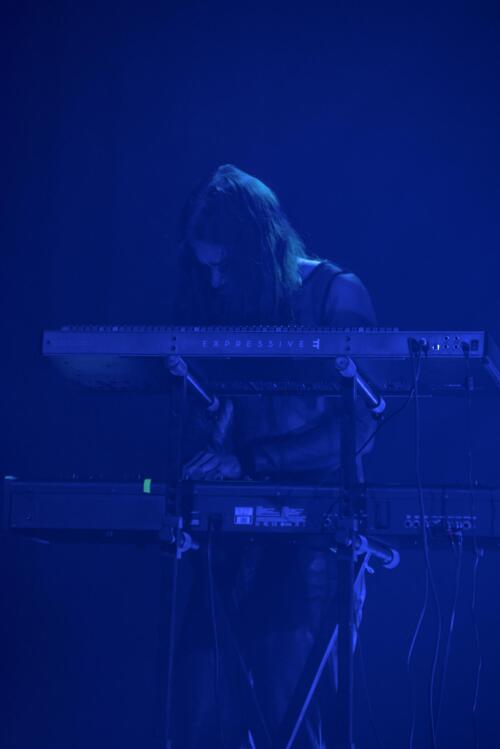 J'ai pu être ainsi surpris que la moitié du set était plutôt orientée Electro/Trip-Hop avec lui aux claviers et une boite à rythme en backing track. De plus, il m'a semblé qu'il gérait lui-même en direct les effets type vocoder sur ses doublements de voix.