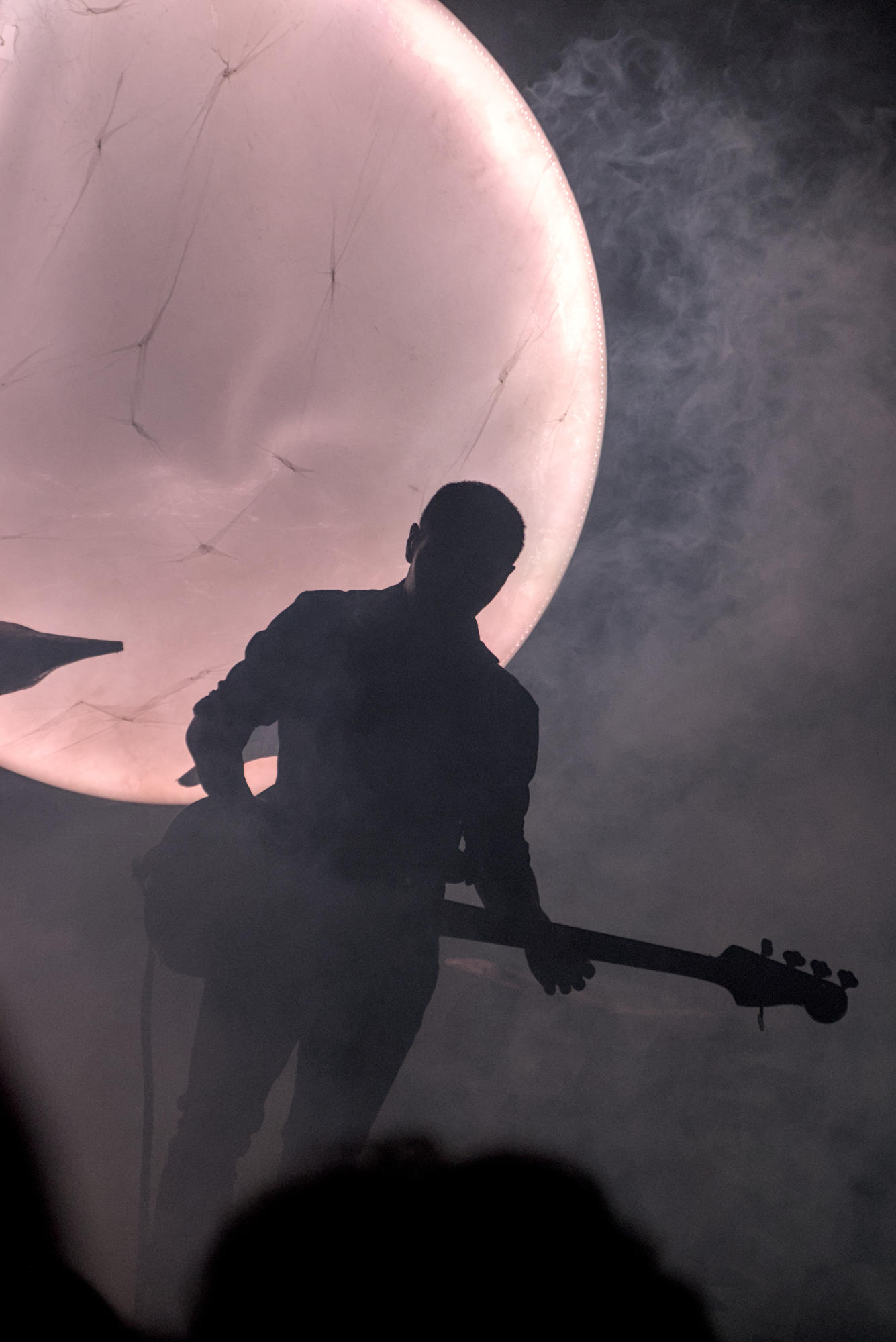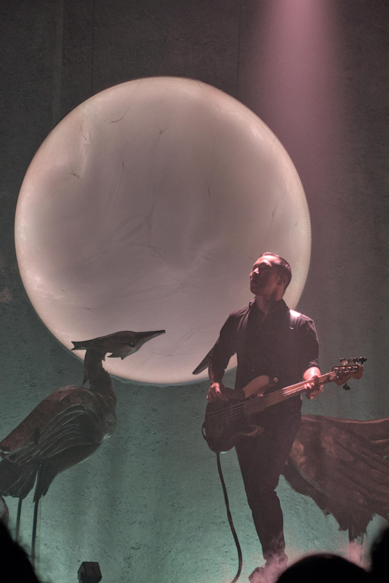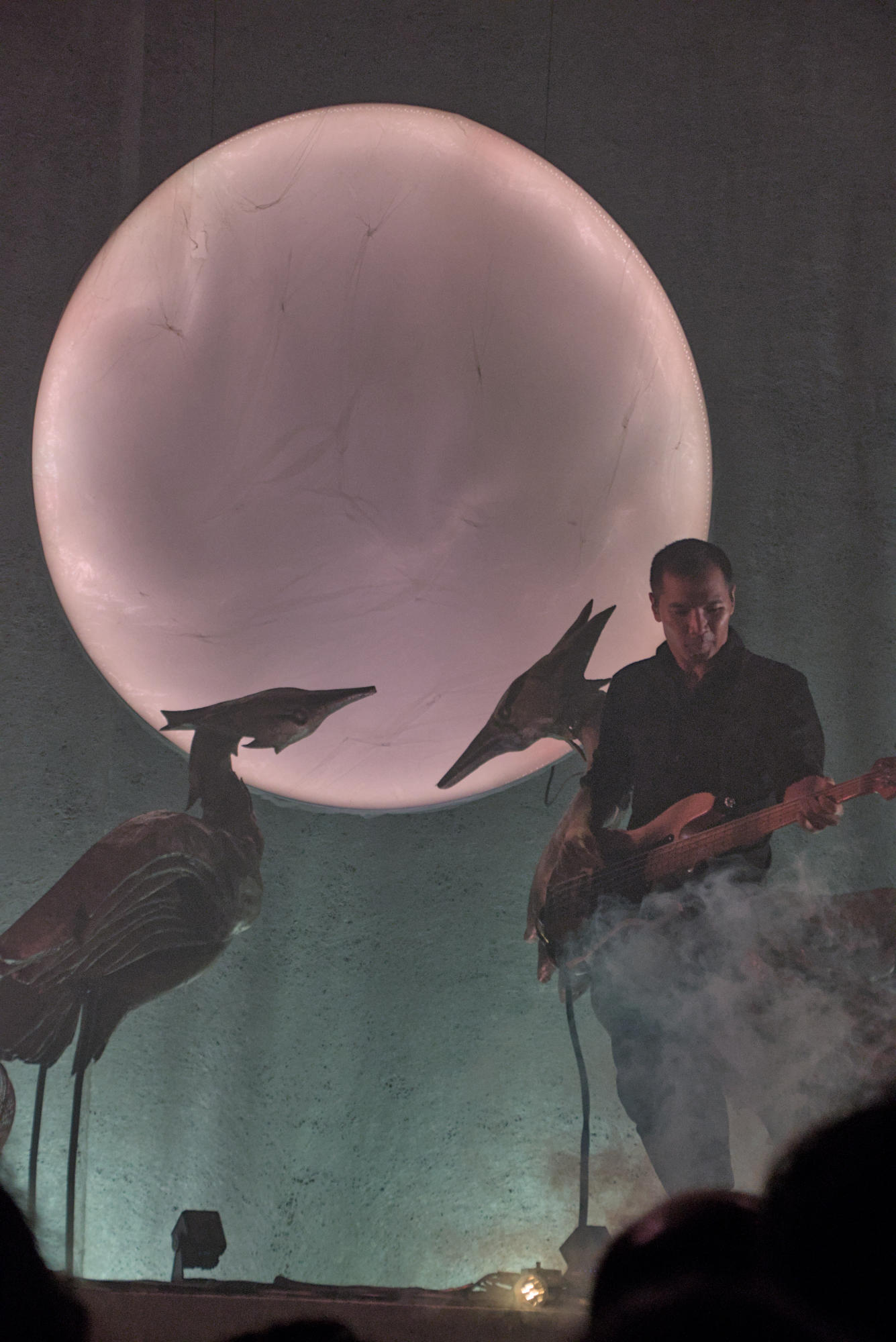 Comme pour leur concert de l’Olympia, nous découvrons une scène simple, mais pourtant magnifique. Quelques roseaux et joncs séchés viennent habiller la scène entre quelques lumières placées ici et là, ainsi qu’un astre brillant en fond de scène qui s’entoure de draps blancs bien texturés. Bien sûr, nous retrouvons aussi les oiseaux de la pochette de l’album en son centre.