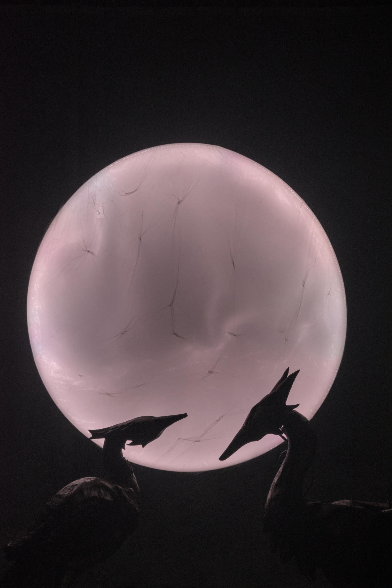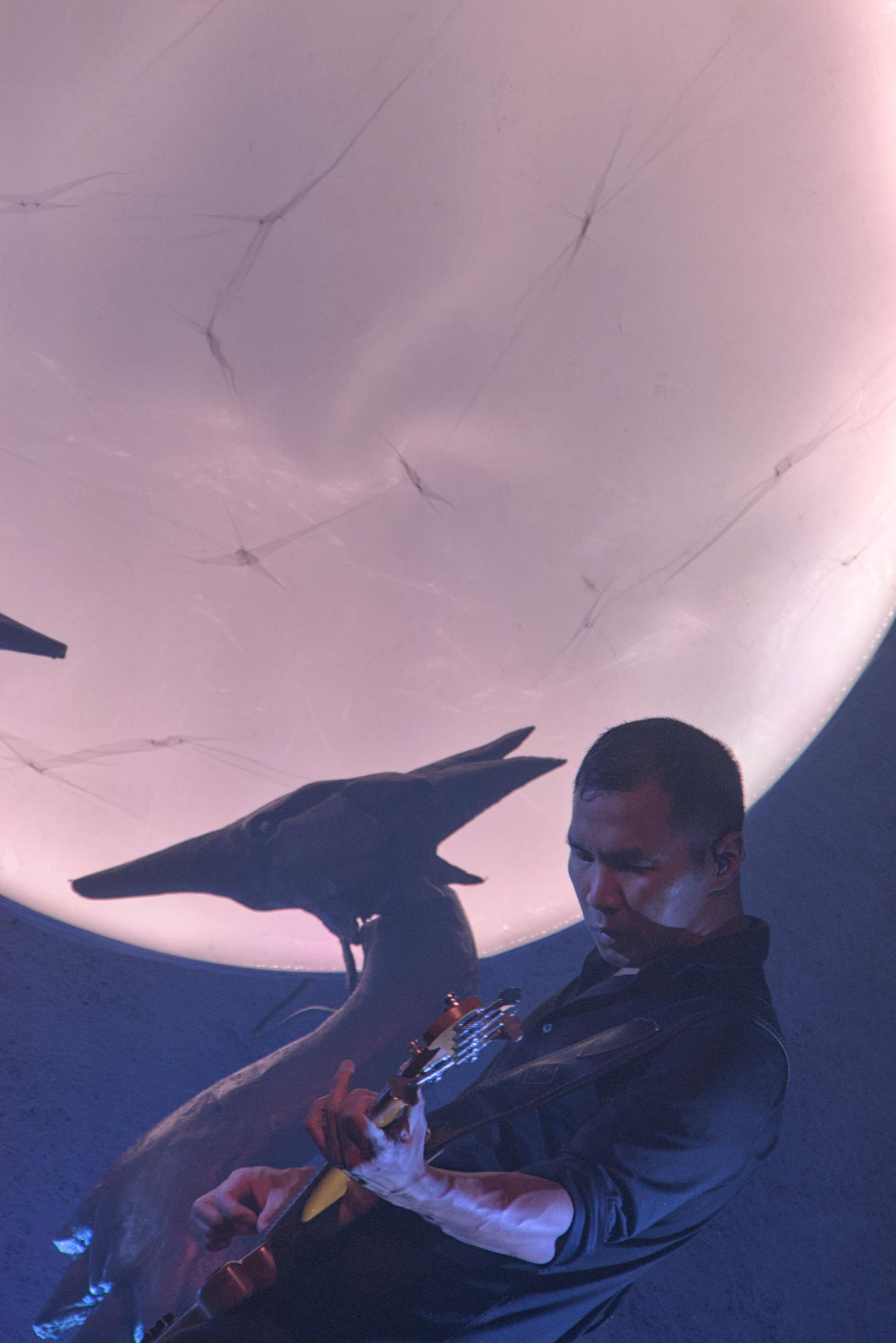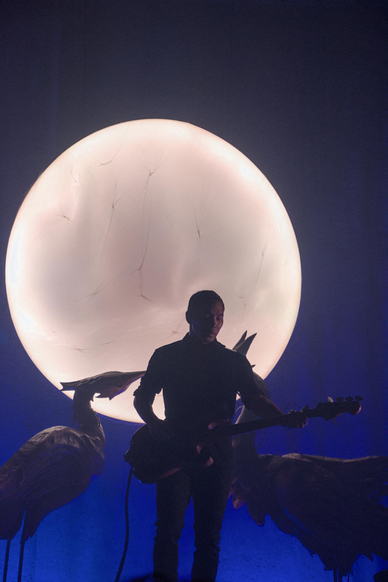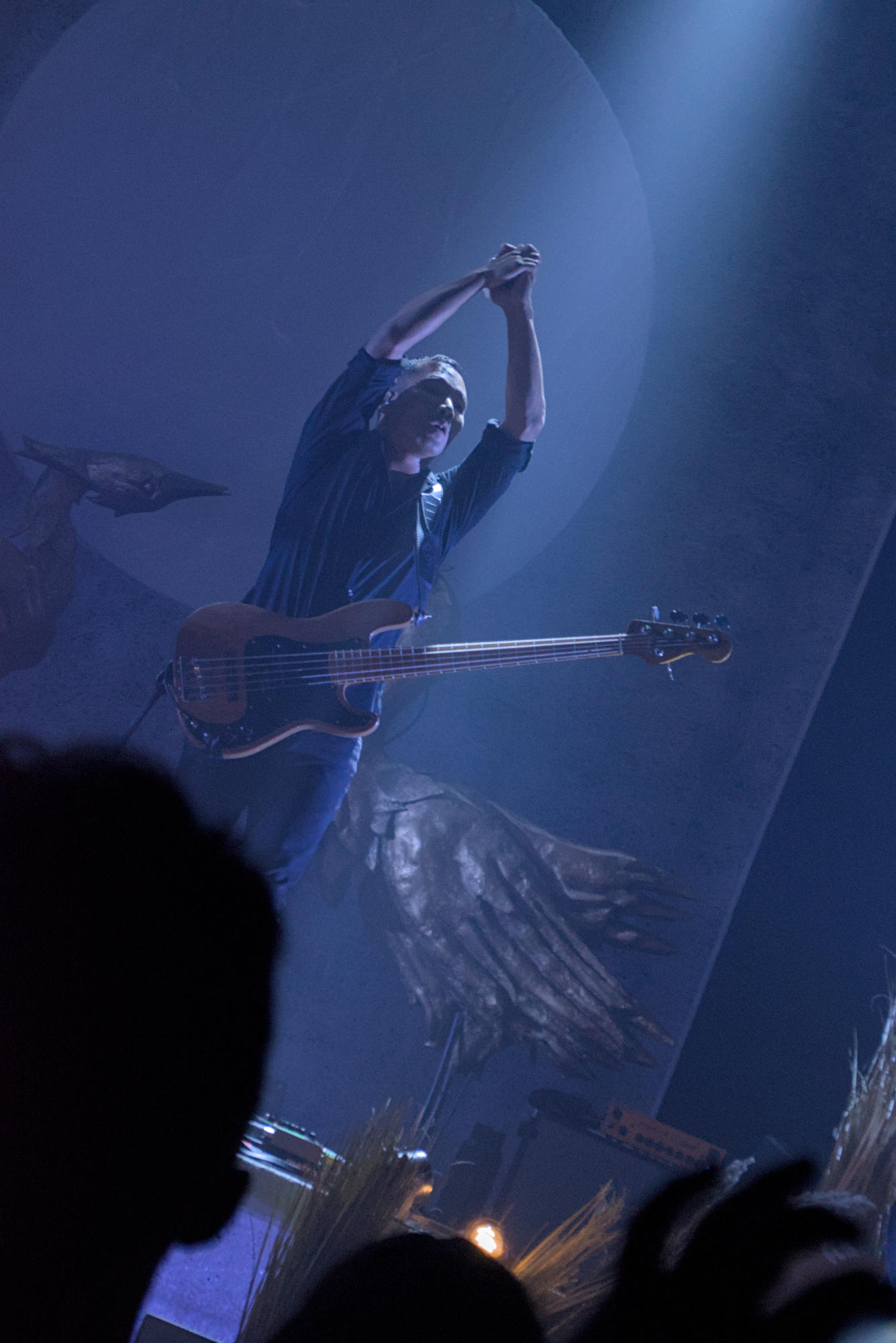 Comme pour leur concert de l’Olympia, nous découvrons une scène simple, mais pourtant magnifique. Quelques roseaux et joncs séchés viennent habiller la scène entre quelques lumières placées ici et là, ainsi qu’un astre brillant en fond de scène qui s’entoure de draps blancs bien texturés. Bien sûr, nous retrouvons aussi les oiseaux de la pochette de l’album en son centre.